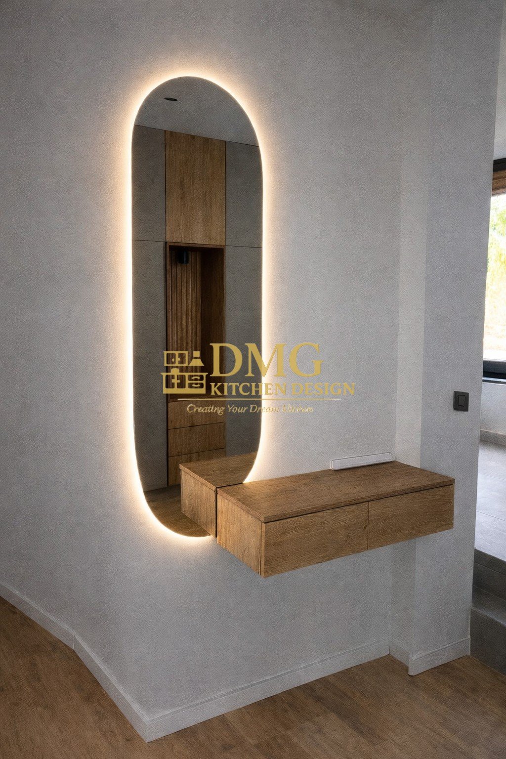 Модерно антре по поръчка с вграден гардероб , LED огледало и дъбов декор . Стилен дизайн , функционалност и изработка по индивидуален проект.