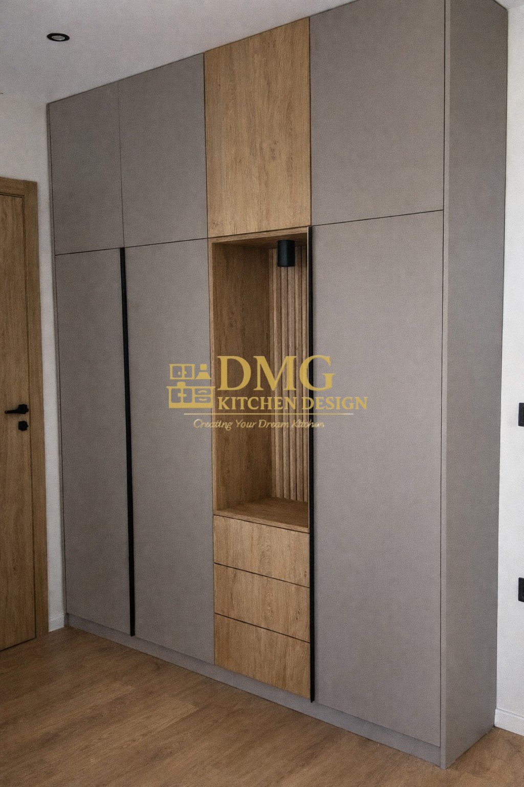 Това модерно антре по поръчка съчетава елегантен дизайн , практичност и дисококачествени материали . Проектът включва вграден гардероб с бездръжкови врати , декоративна ниша с вертикални ламели и топъл дървесен акцент в естествен дъб.