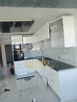 Красива и модерна кухня съчетаваща бял гланц за врати и корпус, черен HPL плот и гръб с мраморене ефект, устойчив на влага, надраскване и високи температури.