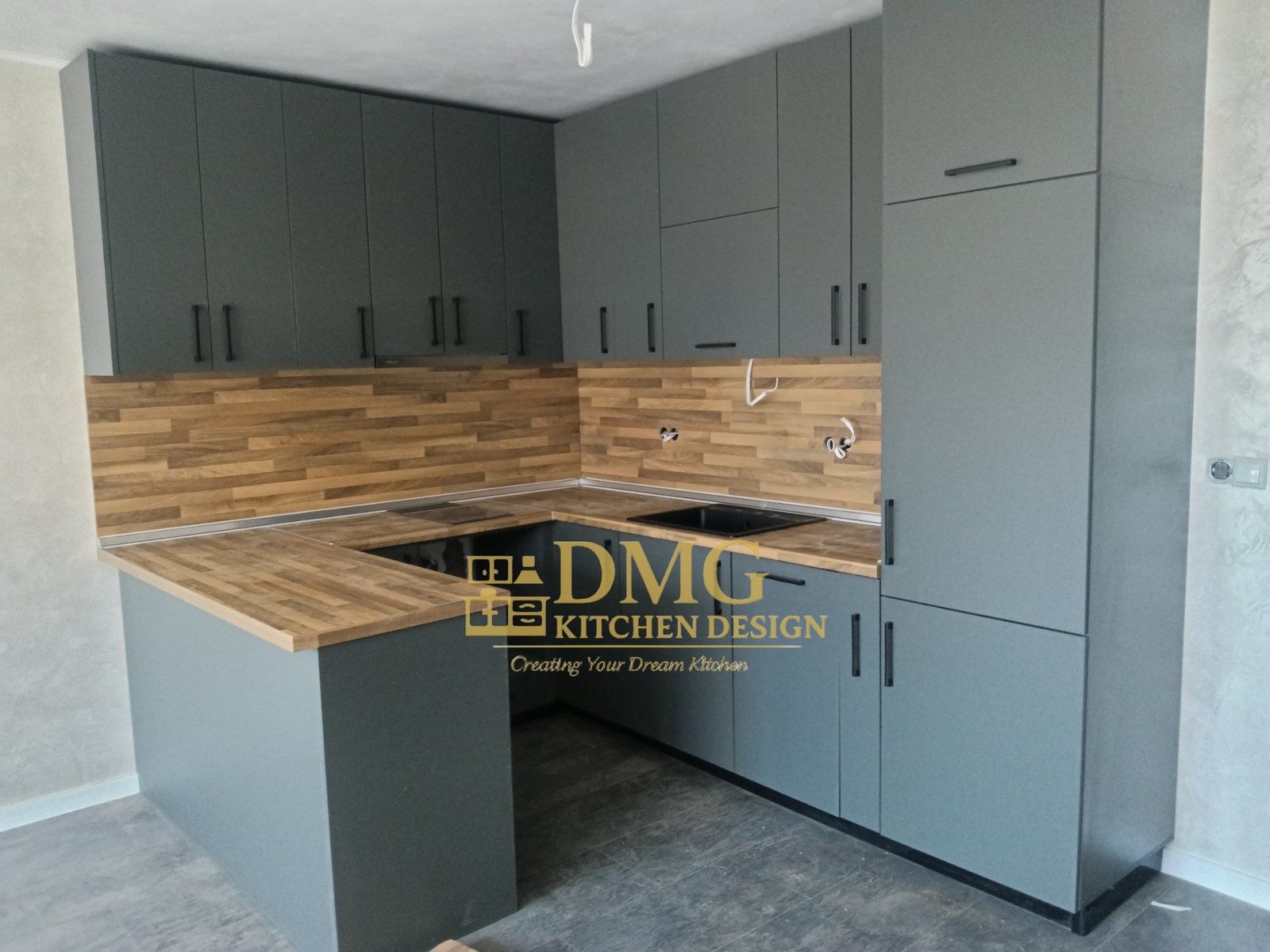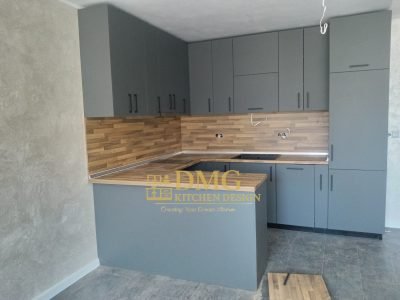Модерна кухня по поръчка с мат сиви MDF врати, дървесен стил плот и гръб - П - образна къхняи