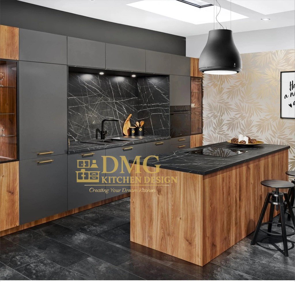 Тази модерна кухня по поръчка съчетава елегантен графитен мат, топъл дървесен декор и ефектен черен мраморен плот и гръб за създаване на луксозна и функционална кухня с остров. Дизайнът е изчистен, съвременен и изключително практичен, подходящ както за апартаменти, така и за къщи с отворено пространство.