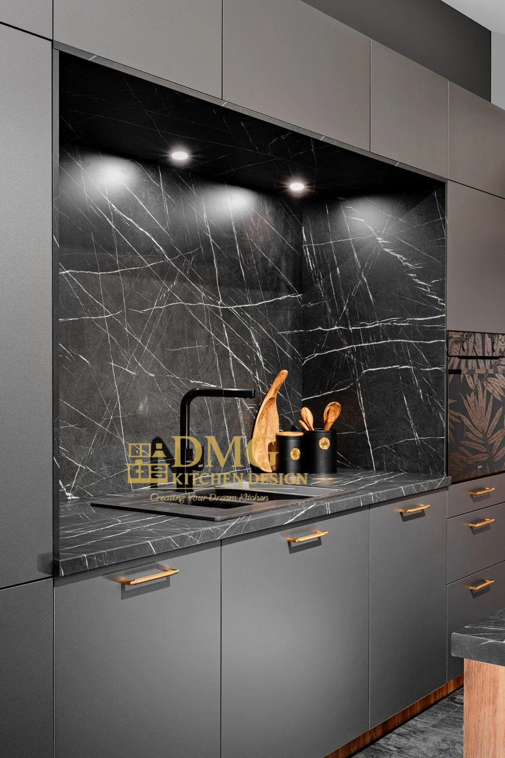 Работна зона с черен мраморен гръб, вградено ЛЕД осветление и модерен дизайн на кухня по поръчка