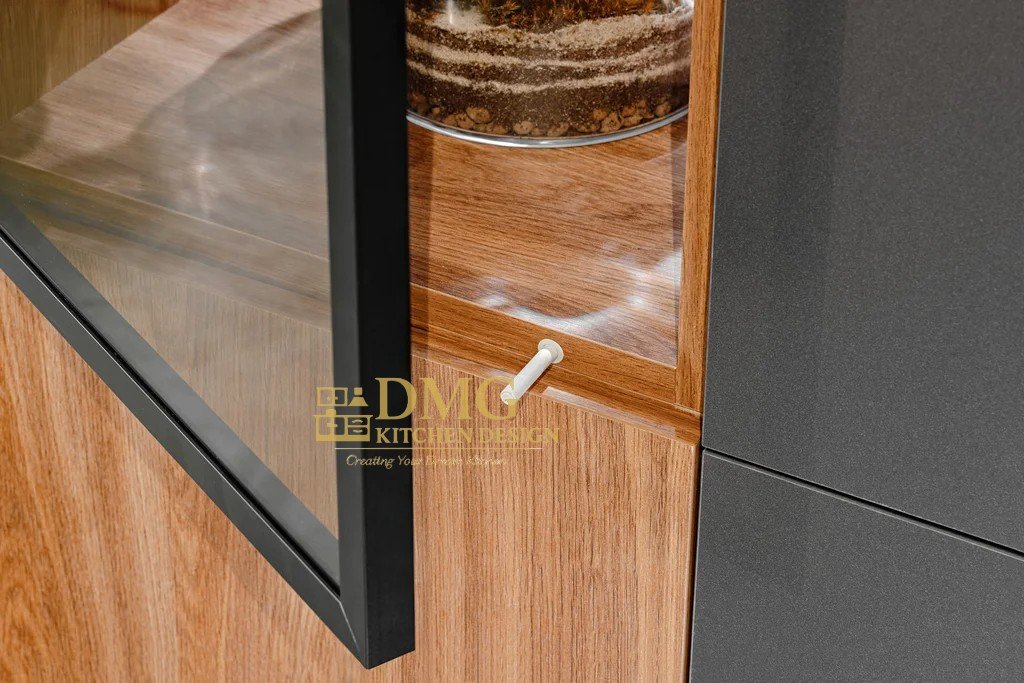 Стъклена витрина с черна рамка и натурален дървесен декор, част от луксозна кухня по индивидуален проект