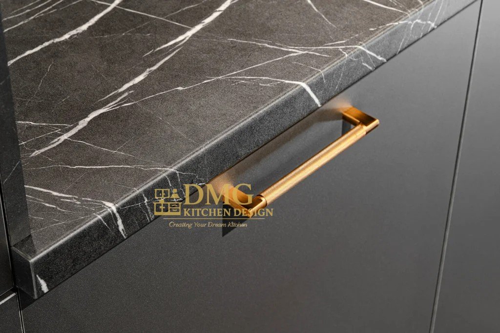 златиста дръжка и черен мраморен плот, детайлот модерна кухня