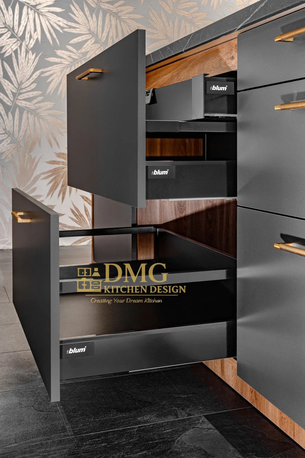 чекмеджете Blum с плавно затваряне в модерна кухня по поръчка