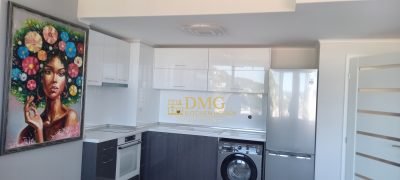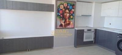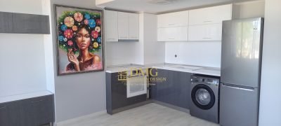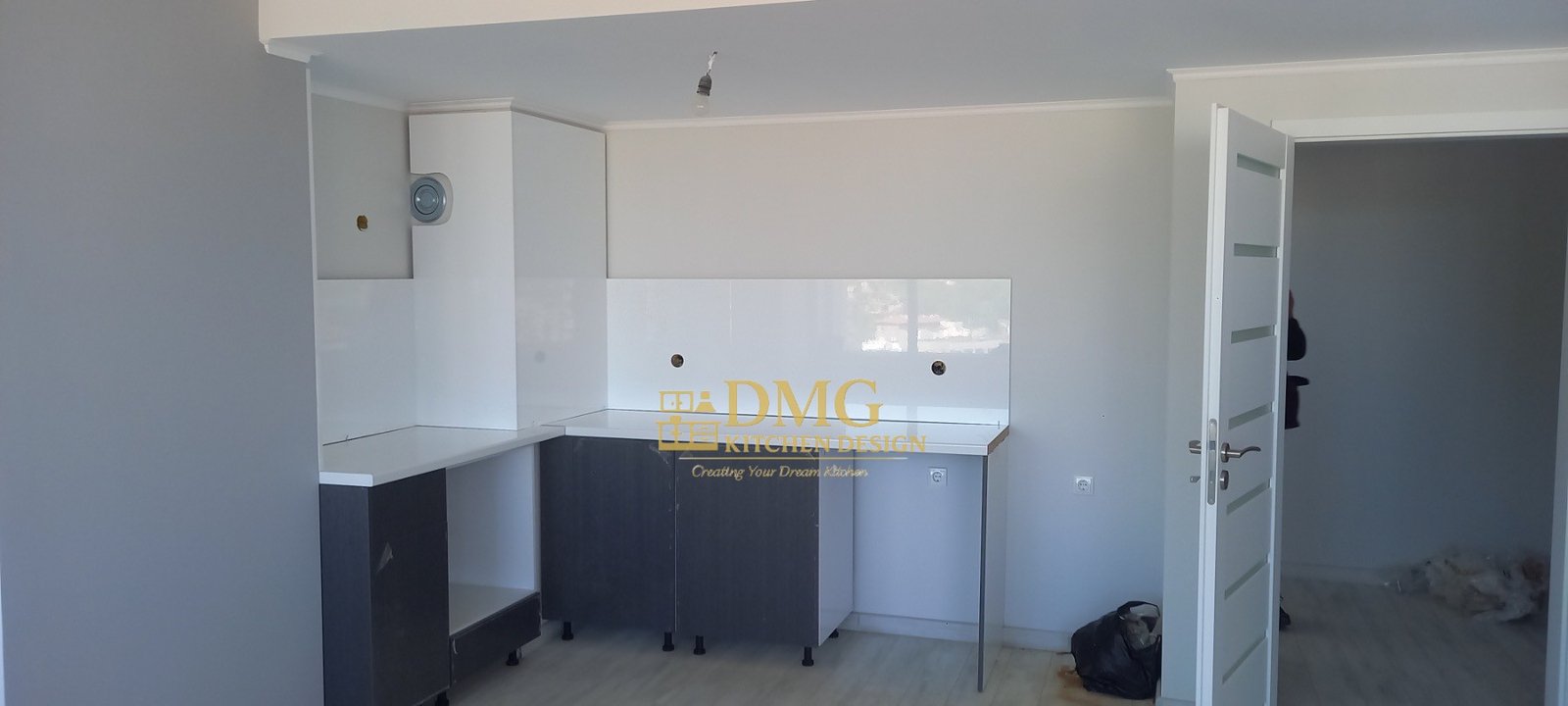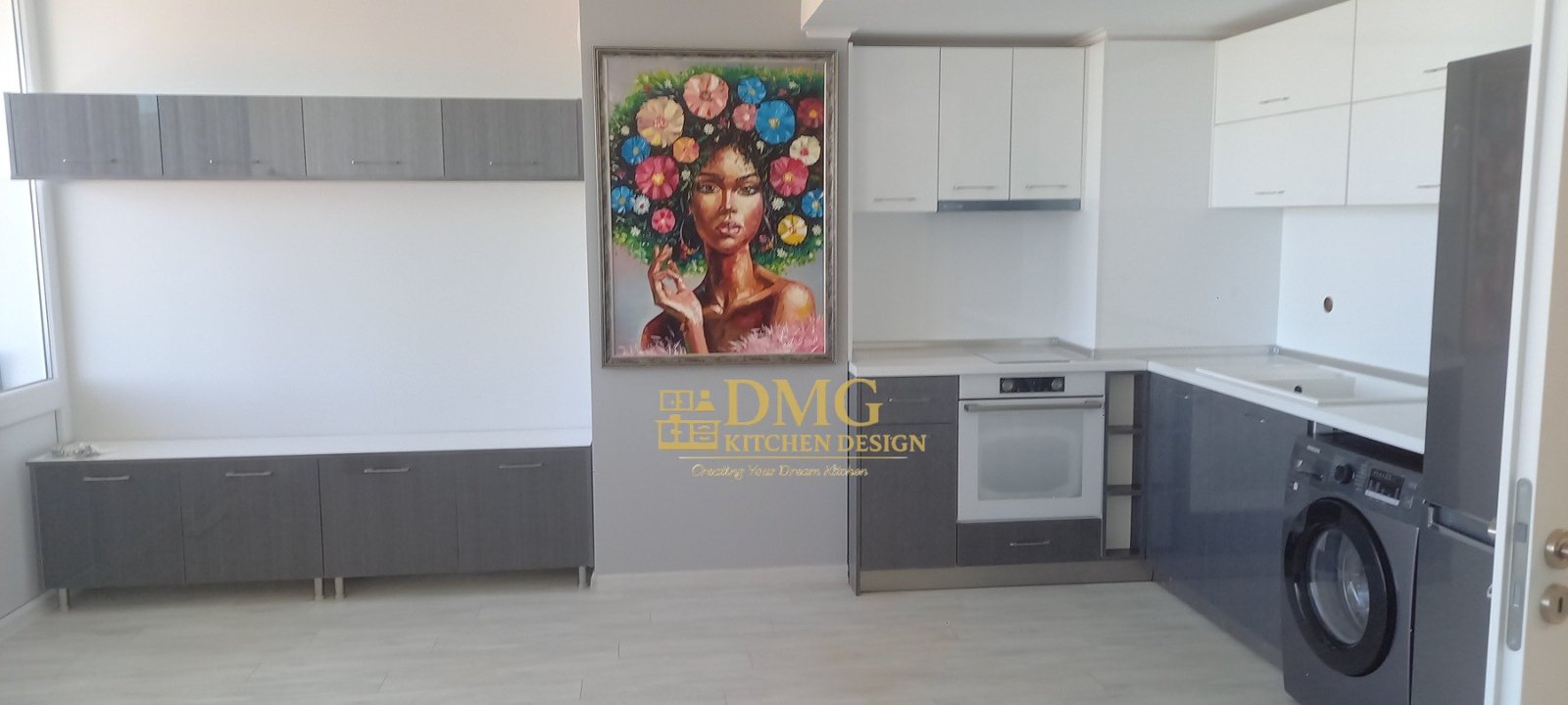 Модерна кухня по поръчка с изчистен дизайн и функционално разпределение. Кухненските шкафове са изработени от ЛПДЧ Egger , с бели гланцови горни фронтове и долни шкафове в тъмносив мат, осигуряващ стилен контраст. Плотът е от влагоустойчив ламиниран материал, а стеннияр гръб е изпълнен с бяло закалено стъкло за лесна поддръжка. Кухнята е с вградени елетроуреди и механизми за плавно затваряне, което я прави практично и дълготрайно решение за съвременен дом