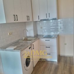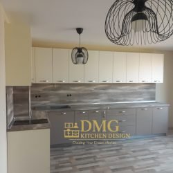 Цялостно изпълнение на модерна кухня по поръчка с изчистени линии,неутрална цветова гама и максимална функционалност. Комбинация от практично разпрделени горни шафове до тавана и качествени материали, съобразени с пространството на клиента