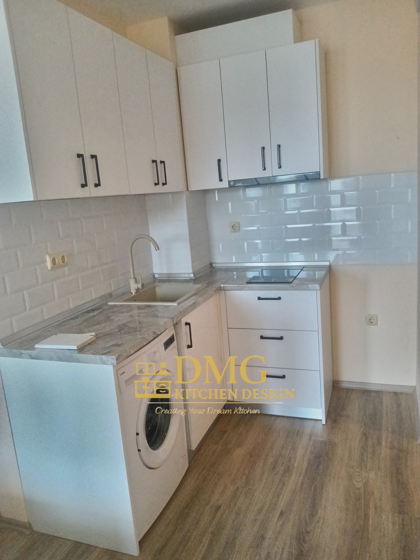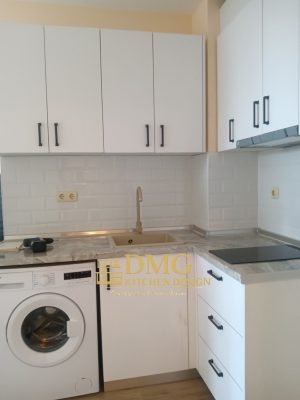 Компактная современная кухня, изготовленная на заказ компанией DMG Kitchen Design, имеет практичную L-образную планировку, обеспечивающую удобство и оптимальное использование пространства. Встроенная бытовая техника и хорошо организованные шкафы делают кухню удобной для повседневного использования, сочетая функциональность и лаконичный дизайн.