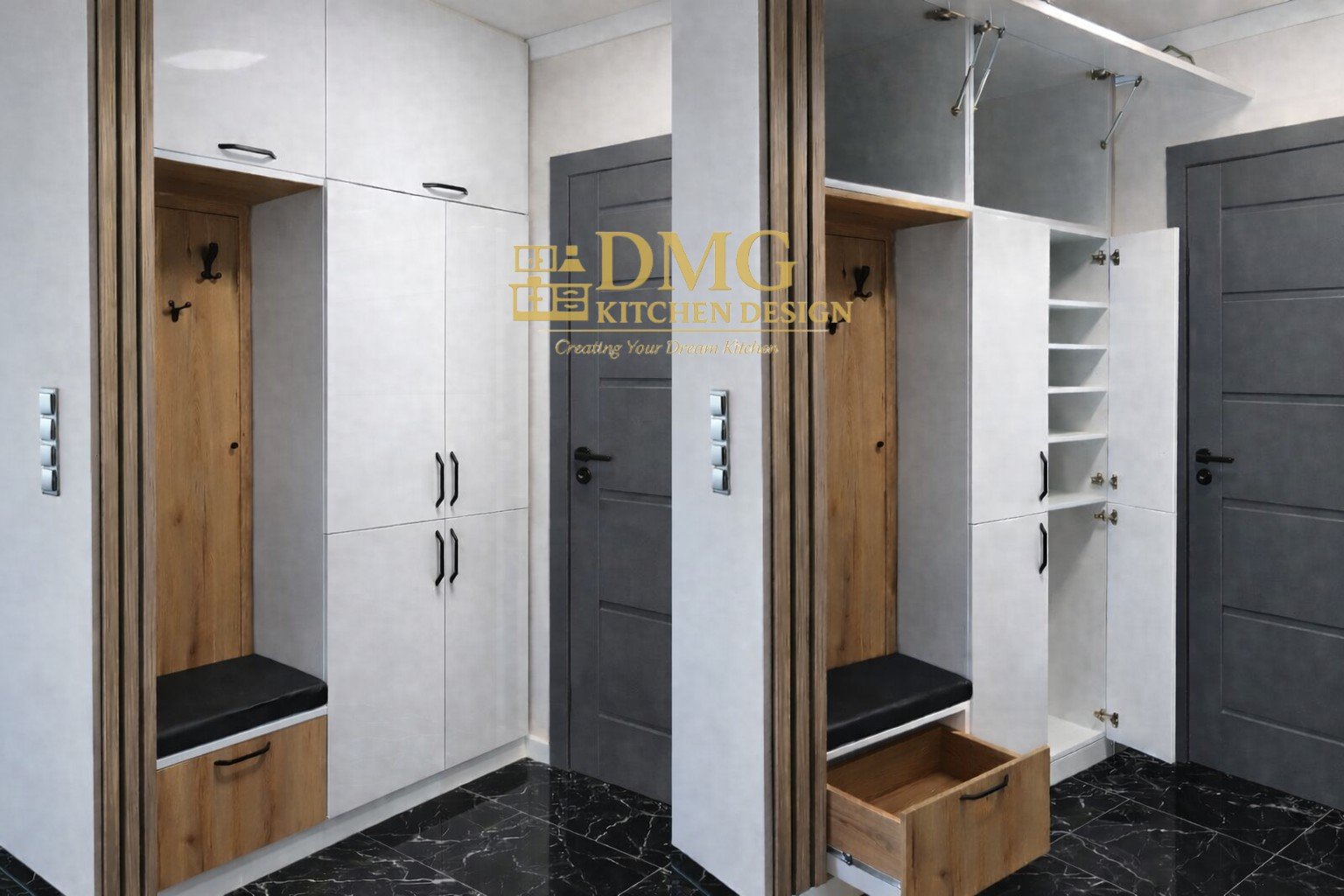 Модерен вграден гардероб за входно антре по поръчка с място за сядане, закачалки и ниша в гардероба за пералня.